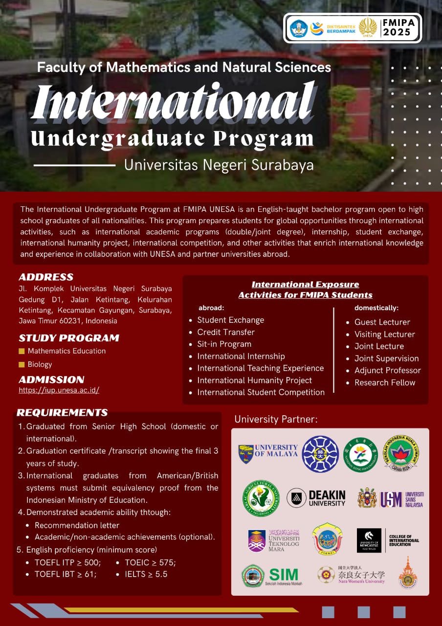 Dalam rangka mendukung internasionalisasi pendidikan tinggi dan meningkatkan daya saing lulusan di tingkat global, Fakultas Matematika dan Ilmu Pengetahuan Alam Universitas Negeri Surabaya resmi meluncurkan dua program studi internasional: International Undergraduate Program untuk S1 Pendidikan Matematika dan International Undergraduate Program untuk S1 Biologi.