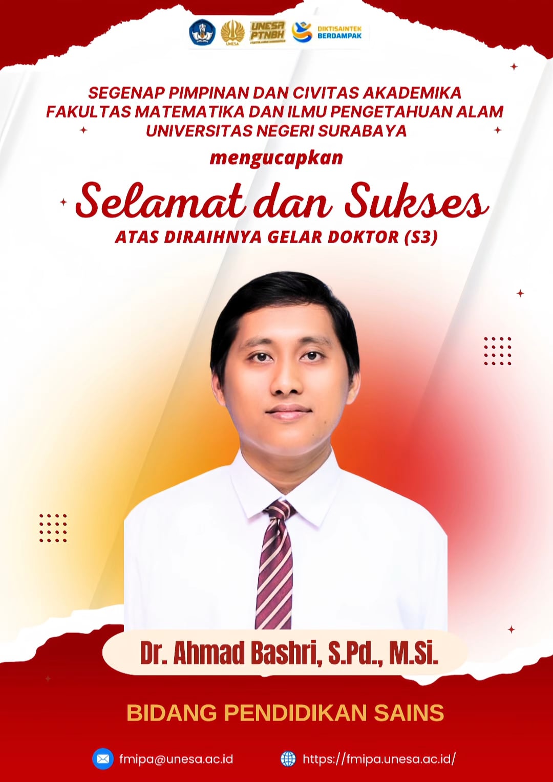 Selamat dan sukses kepada Dr. Ahmad Bashri, S.Pd., M.Si. atas diraihnya gelar doktor dalam bidang Pendidikan Kimia. Semoga gelar dan ilmunya berkah, menjadi pribadi yang terus mengabdi, berkontribusi, serta bermanfaat bagi diri sendiri, keluarga, masyarakat, agama dan negara. Aamiin Yaa Robbal Aalamin.