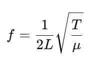 yang menunjukkan bahwa frekuensi (f) berbanding terbalik dengan panjang (L) dan berbanding lurus dengan akar dari rasio tegangan (T) terhadap massa per satuan panjang (μ).