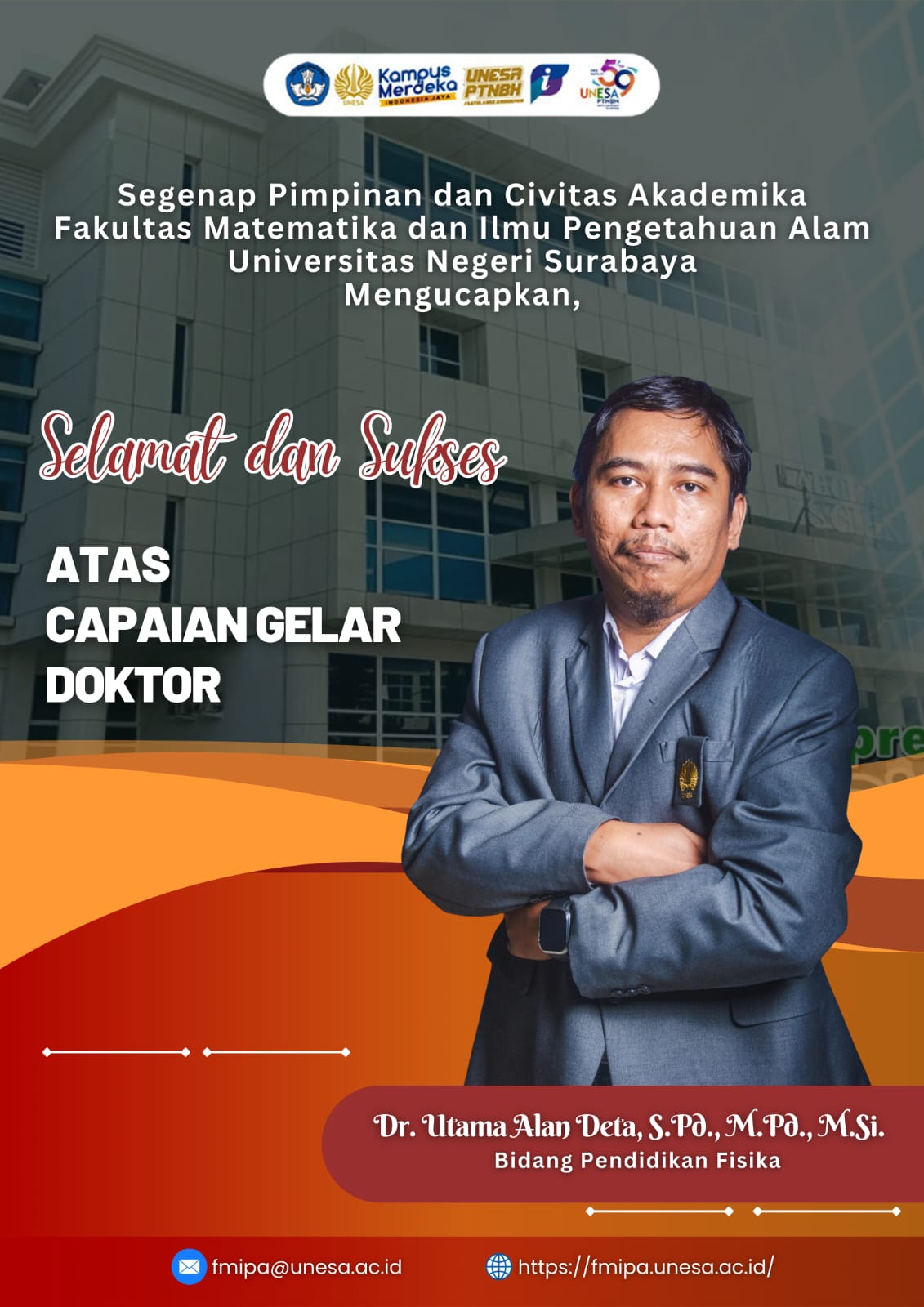 Selamat dan sukses kepada Dr. Utama Alan Deta, S.Pd., M.Pd., M.Si. atas diraihnya gelar doktor dalam bidang Pendidikan Fisika.