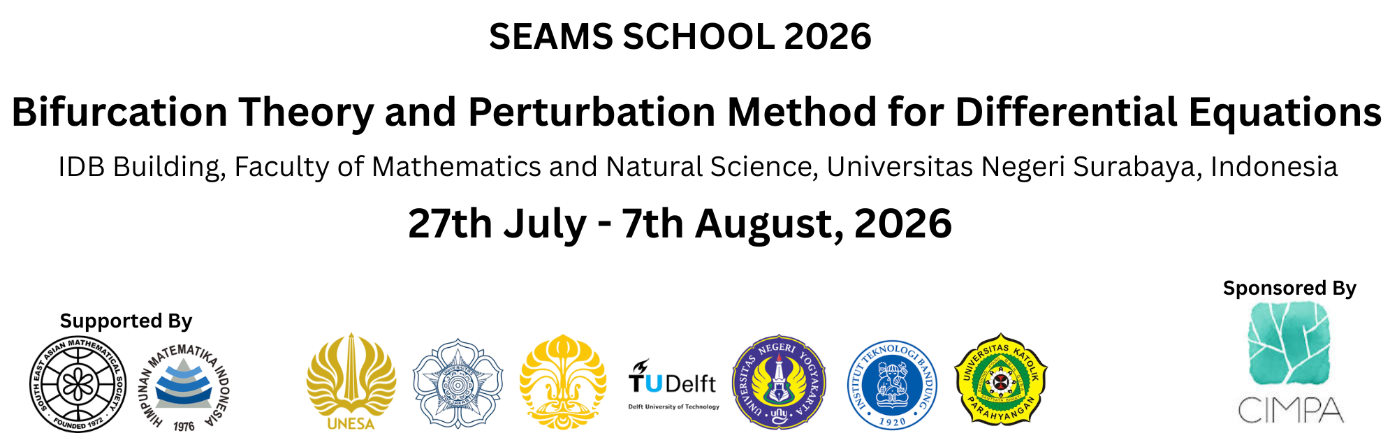 The SEAMS School 2026, entitled Workshop on Bifurcation Theory and Perturbation Method for Differential Equations, is part of a long-standing international academic program that has been organized regularly since 2001. In 2026, the School will be hosted by the Department of Mathematics, Faculty of Mathematics and Natural Sciences (FMIPA), Universitas Negeri Surabaya (Unesa), Indonesia. The workshop will take place at the Ketintang Campus and is supported by the Indonesian Mathematical Society, with academic collaboration from several national and international partner universities.