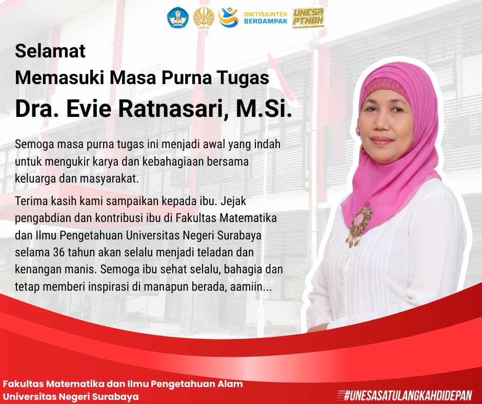 Views: 20Segenap keluarga besar Fakultas Matematika dan Ilmu Pengetahuan Alam (FMIPA), Universitas Negeri Surabaya (Unesa) mengucapkan Selamat Memasuki Masa Purna Tugas kepada Ibu Dra. Evie Ratnasari, M.Si. (Dosen FMIPA Unesa periode 1989 – 2025 di Program Studi S1 Biologi) Terima kasih kami sampaikan kepada Ibu.Jejak pengabdian dan kontribusi Ibu kurang Read More …