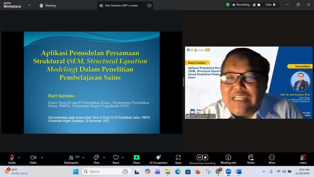 Views: 7Surabaya, 26 November 2025 — Program Studi S2/S3 Pendidikan Sains, Fakultas Matematika dan Ilmu Pengetahuan Alam (FMIPA) Universitas Negeri Surabaya kembali menyelenggarakan kuliah tamu (Guest Lecture) sebagai bagian dari penguatan kompetensi metodologi penelitian bagi mahasiswa pascasarjana. Kegiatan kali ini menghadirkan Prof. Dr. Hari Sutrisno, M.Si., Guru Besar Fakultas Matematika Read More …